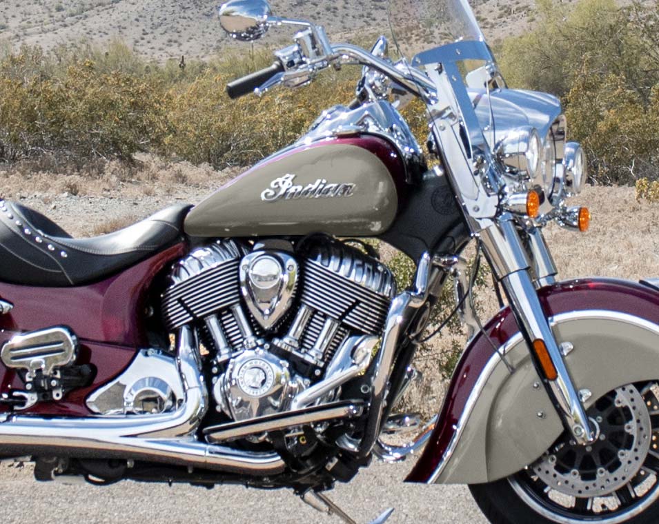 | 標準装備 | クイックリリース・ウインドシールド、リモートロック式ハードサドルバッグ、ハイウェイバー、ライドモード、ABS、クルーズコントロール、キーレスイグニッション、インディアン®スクリプトタンクバッジ、12V充電ポート |